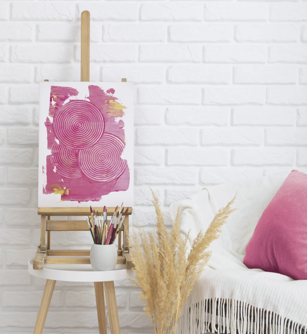 Mit „Pink Circles“ kommt das nächste knallige Bild für den Sommer. Wie die meisten von euch wissen, liebe ich neutrale Farben, in der Mode und auch beim Interior. Ab und zu überkommt mich aber die Lust nach Farbe und in dem Fall meine diesjährige Lieblingskombi Pink-Gelb. Dieses Acrylbild macht einfach gute Laune. Das Bild wurde aus Acrylfarben und Strukturpasten erstellt und schafft mithilfe der eingesetzten Werkzeuge eine wunderschöne 3D-Optik und Haptik. Mit diesem Bild bringst du Farbe in dein Wohnzimmer. Der Sommer kann kommen!